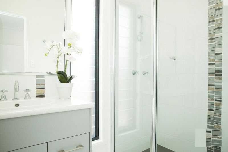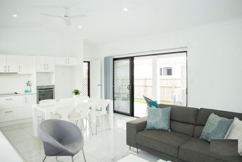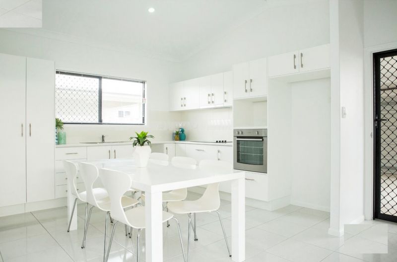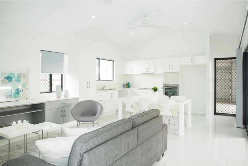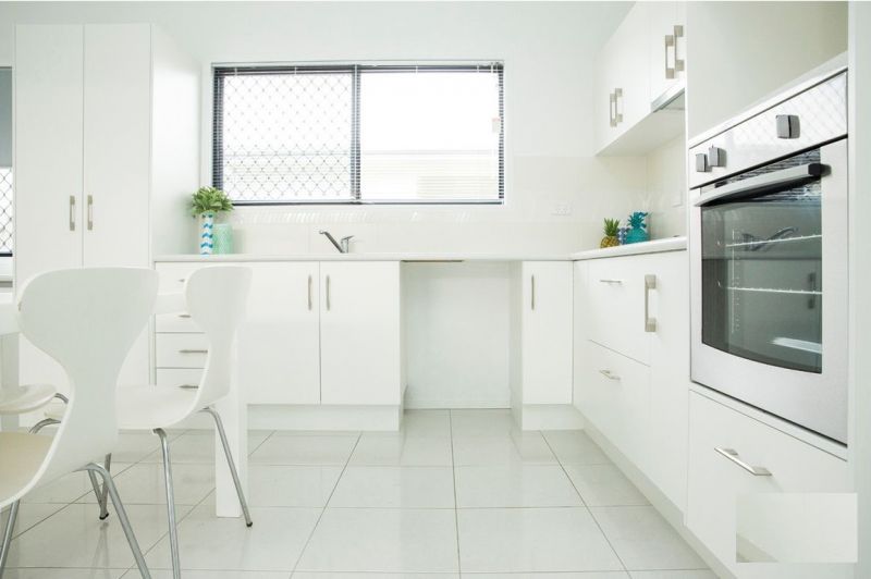 • Open plan tiled lounge, dining and white modern kitchen with all the mod cons.