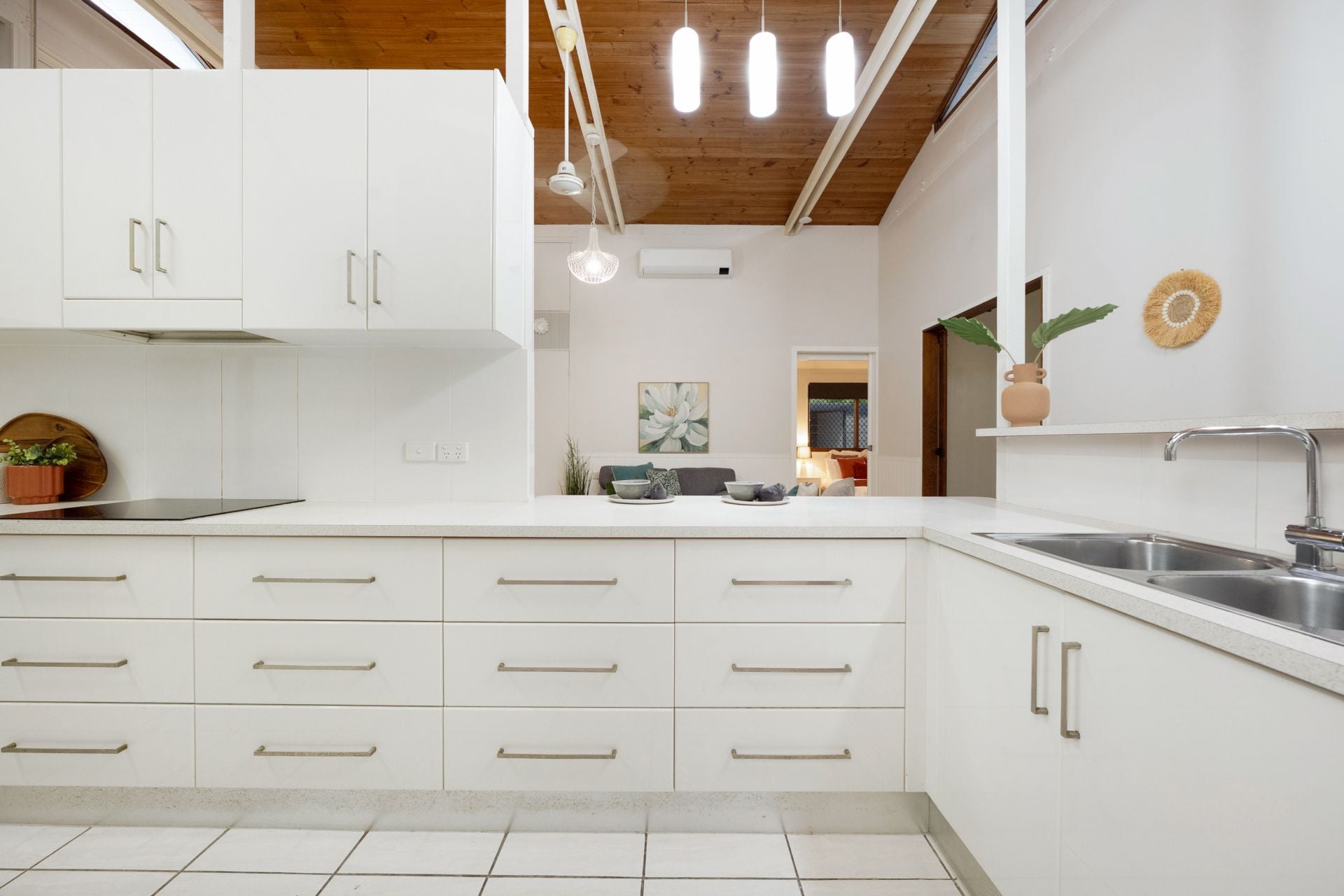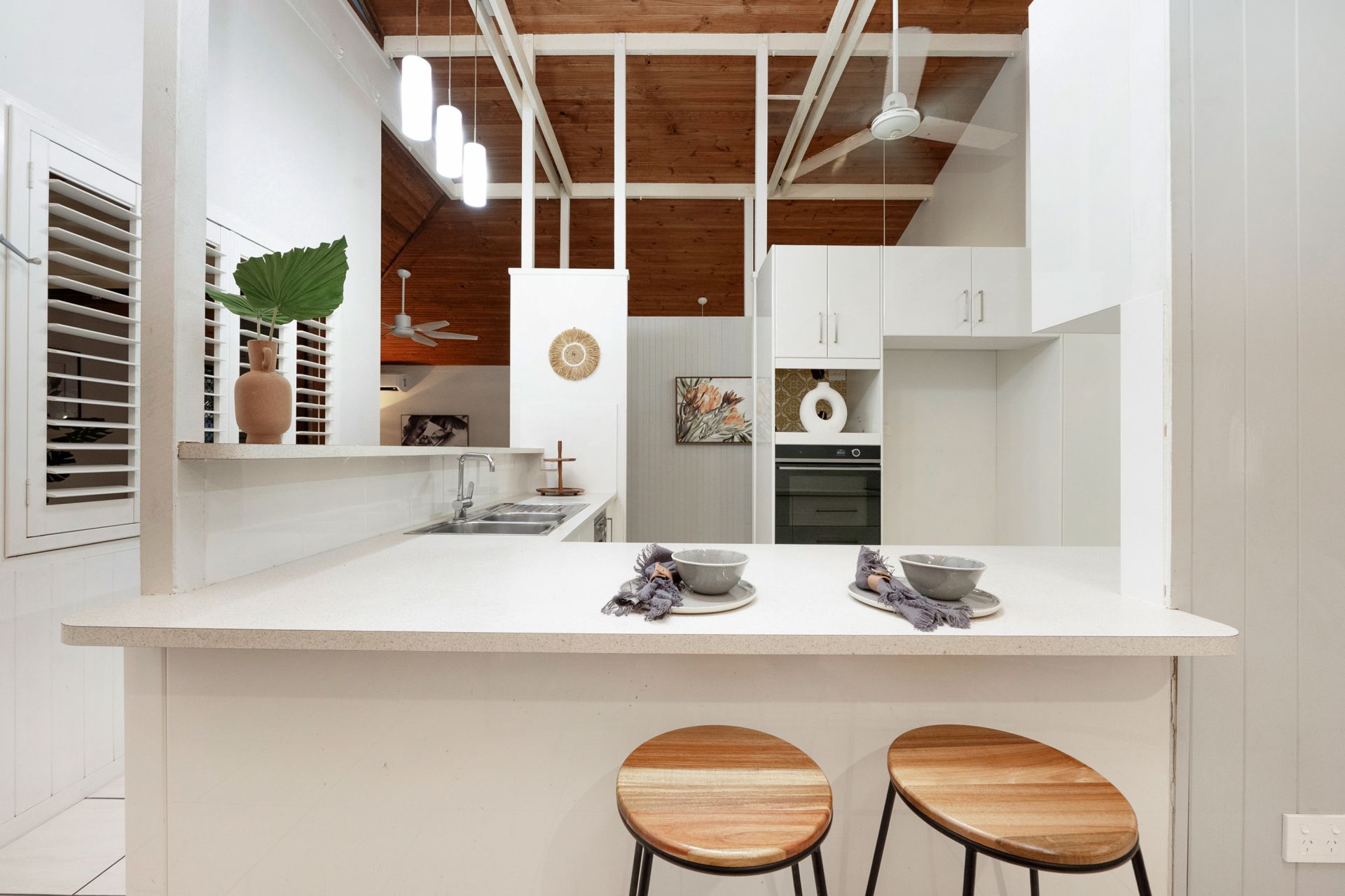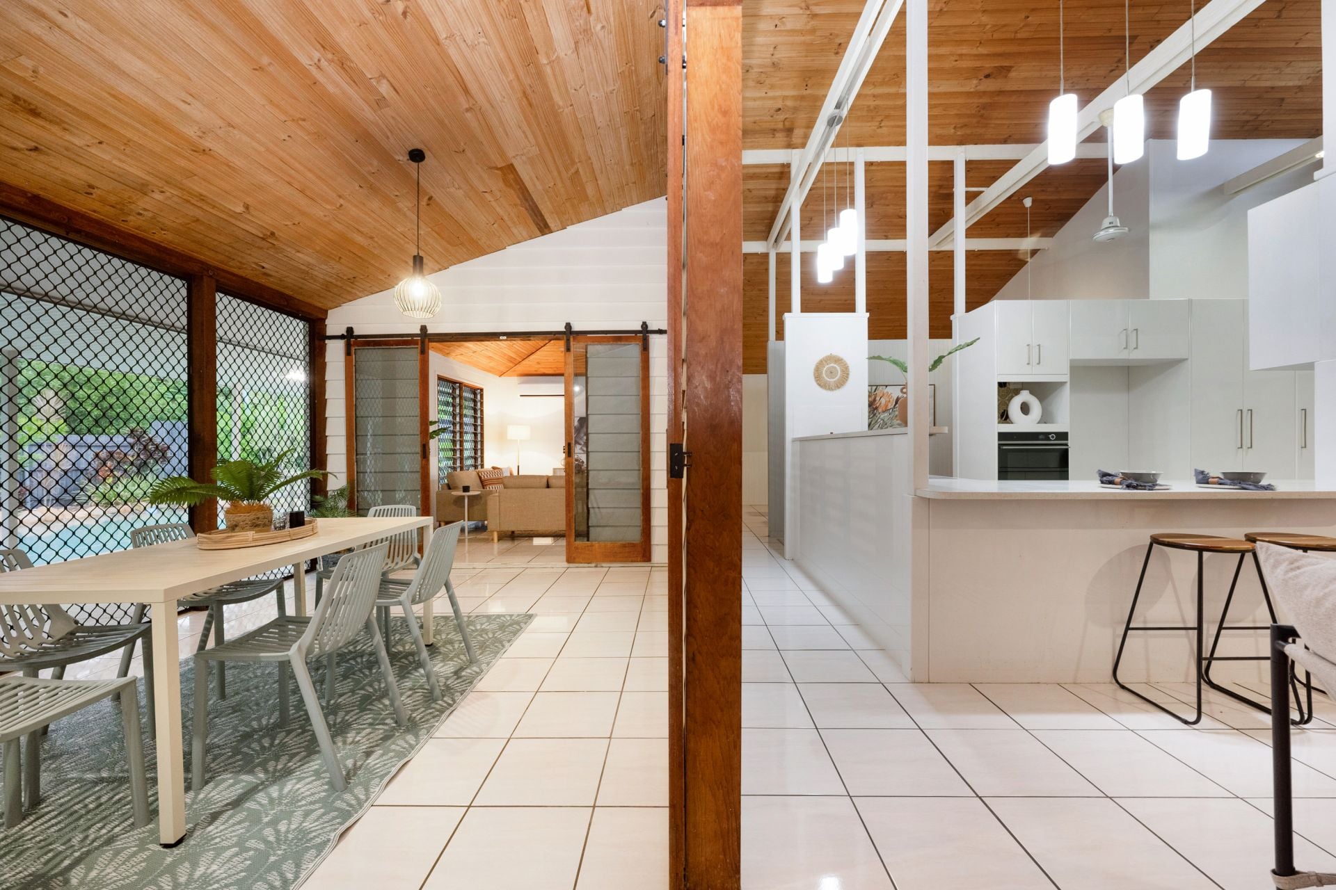 From the moment you step inside, the home makes a statement - soaring raked ceilings with exposed timber beams create an incredible sense of volume, while natural light floods the open-plan living zones. It's a home that feels both warm and architecturally unique, perfectly suited to relaxed North Queensland living.
