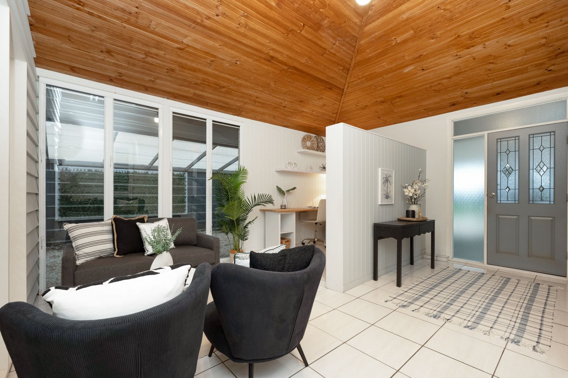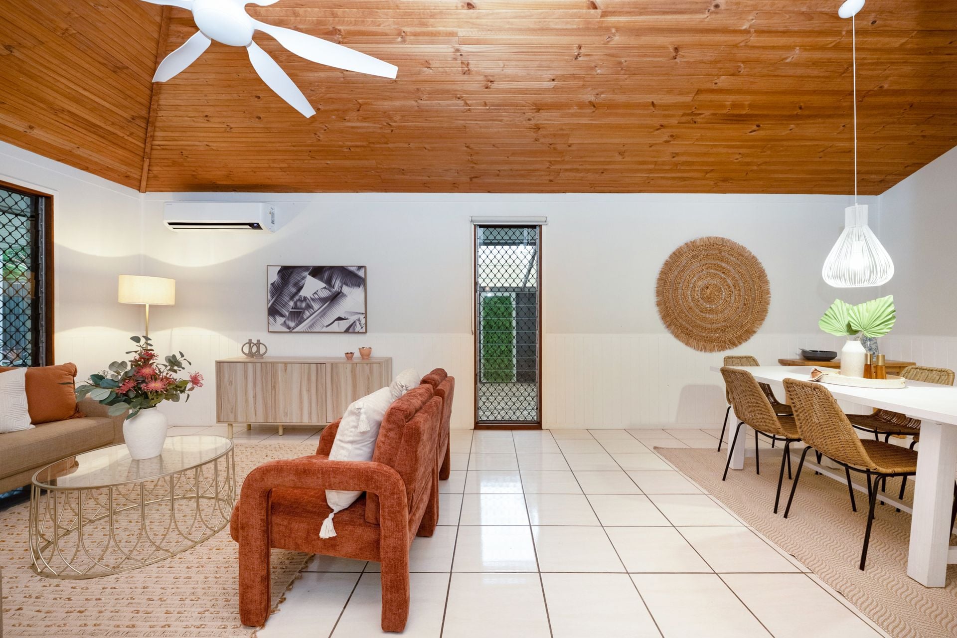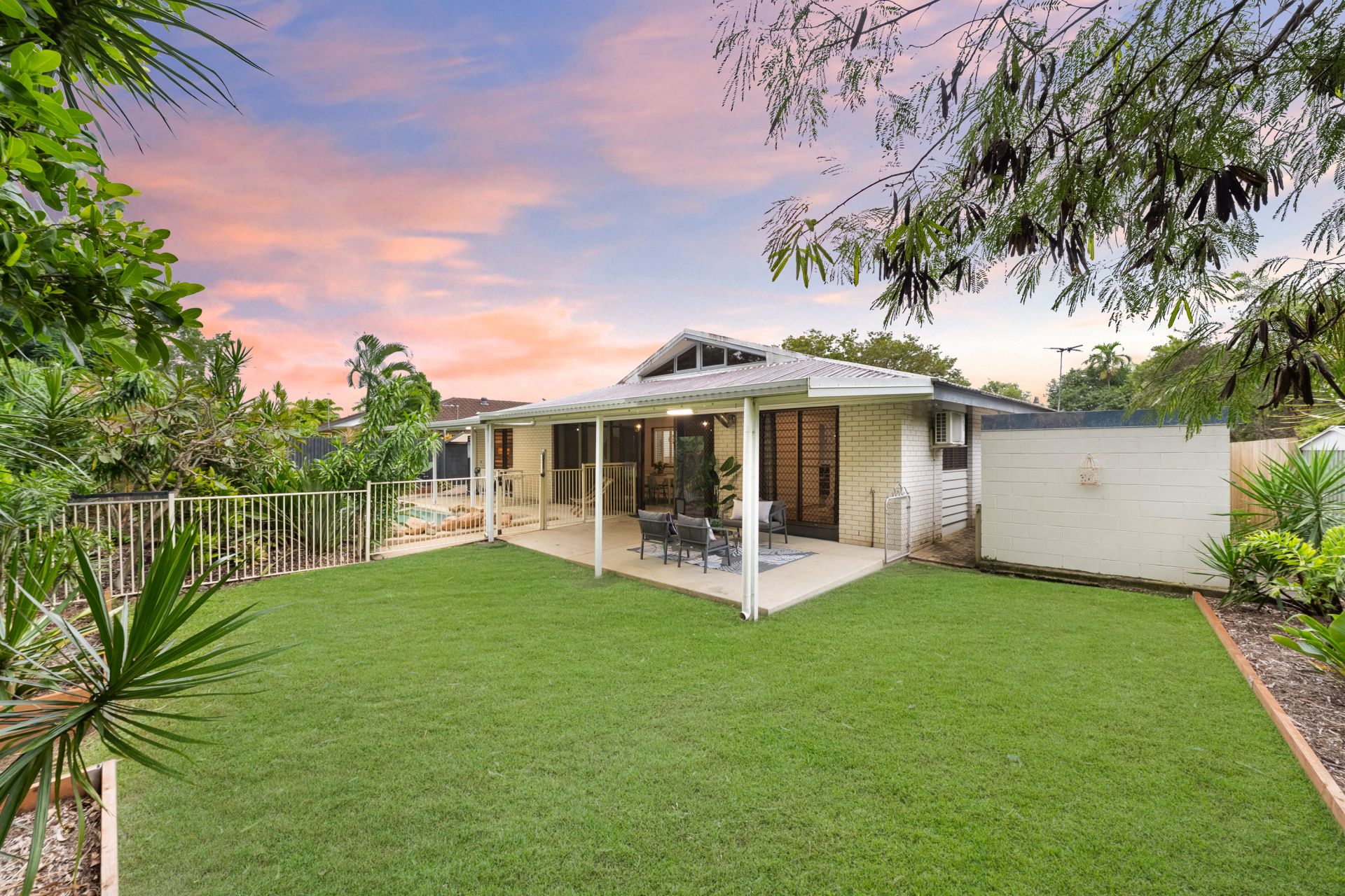 From the moment you step inside, the home makes a statement - soaring raked ceilings with exposed timber beams create an incredible sense of volume, while natural light floods the open-plan living zones. It's a home that feels both warm and architecturally unique, perfectly suited to relaxed North Queensland living.