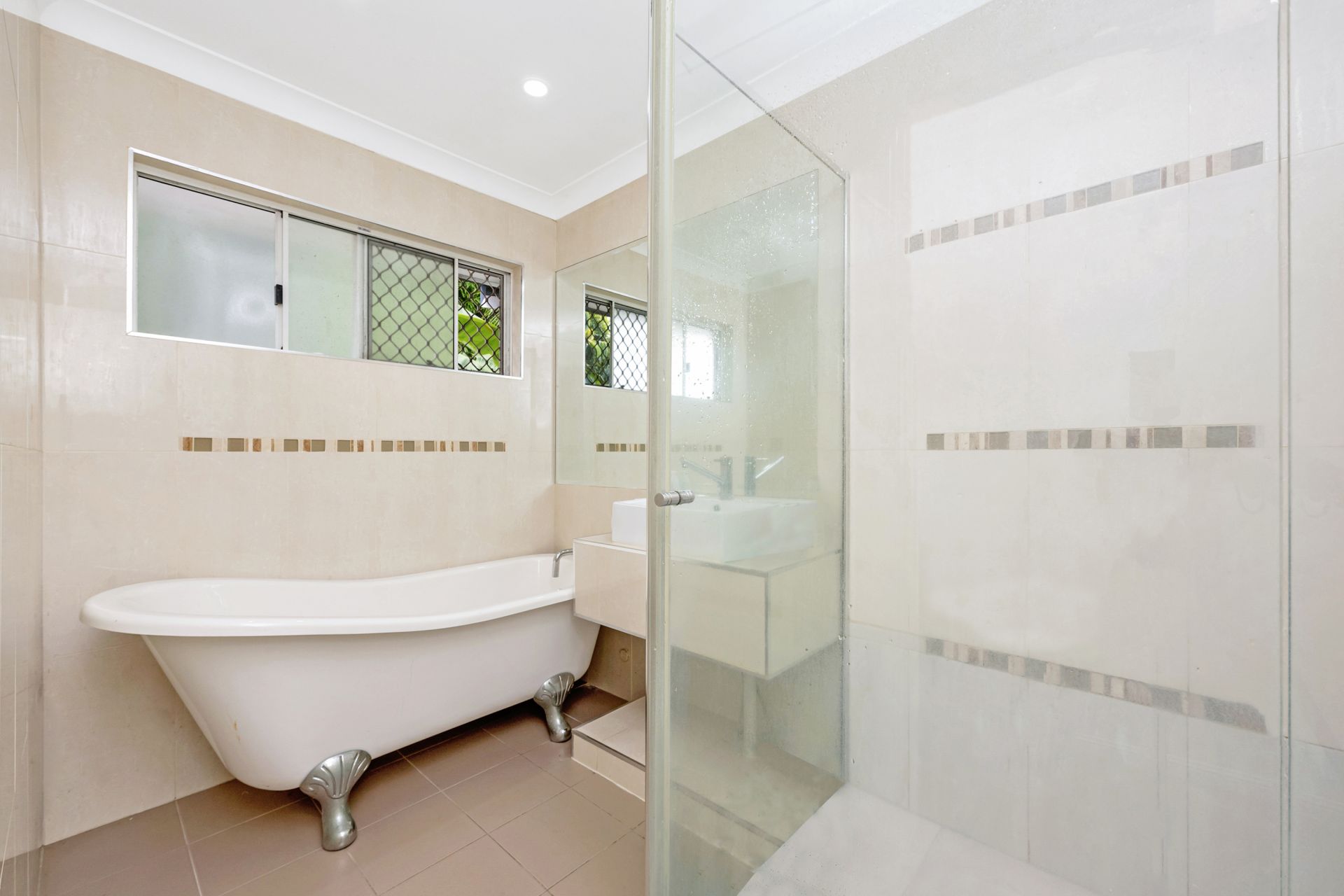 Bathroom with shower and free-standing bath