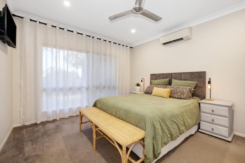 - The entire main home is fully air conditioned with split systems, has quality window coverings, the majority of windows do you have plantation shutters, security screens and doors to most
