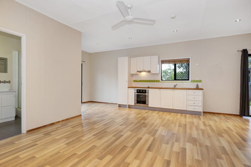 - Part of the shed has been converted to another living or work from home area, which has vinyl planking, small kitchen area with cooktop, under bench oven and rangehood, plus a storage/robe cupboard