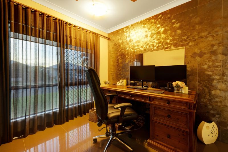 Inside, every space has been thoughtfully appointed. Nautical styling with a dressed blue-and-white palette echoing the sea, while striking inclusions like a metallic tiled feature wall in the office-cum-fourth-bedroom and floor-to-ceiling marble-look tiles in the bathrooms dial up the elegance. The kitchen offers plenty of storage and showstopping style, with a plumbed-in fridge, self-cleaning double oven, and under-bench light detail in soft hues. Plantation shutter sliders open to reveal a sun-soaked patio and low-maintenance garden framed by lipstick palms and a heated magnesium pool with triple waterfall feature.