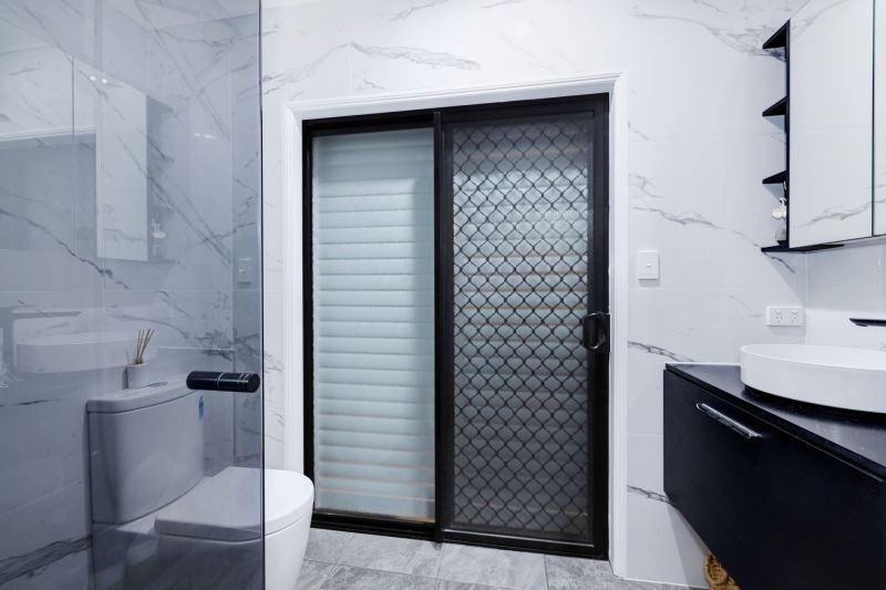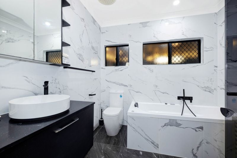 • The spa ensuite, floor-to-ceiling tiling, and dramatic black tapware