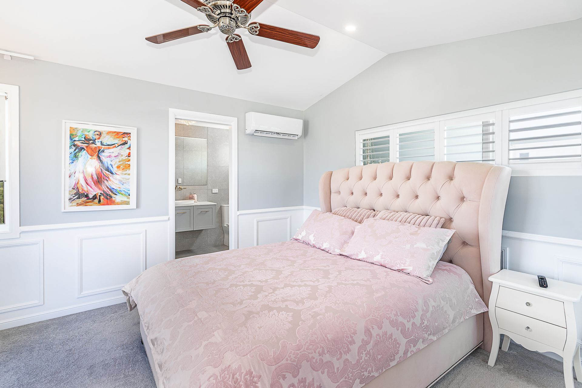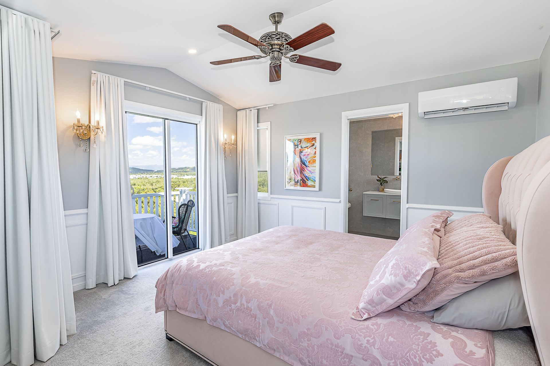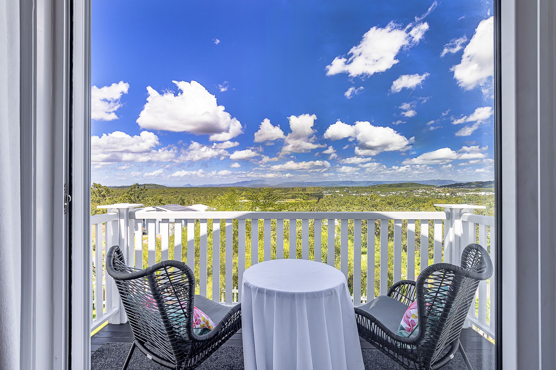 * Huge king sized carpeted master bedroom suite with large walk in robe and TV connectivity opens out to a private balcony with magnificent views out to the mountains of Hervey's Range