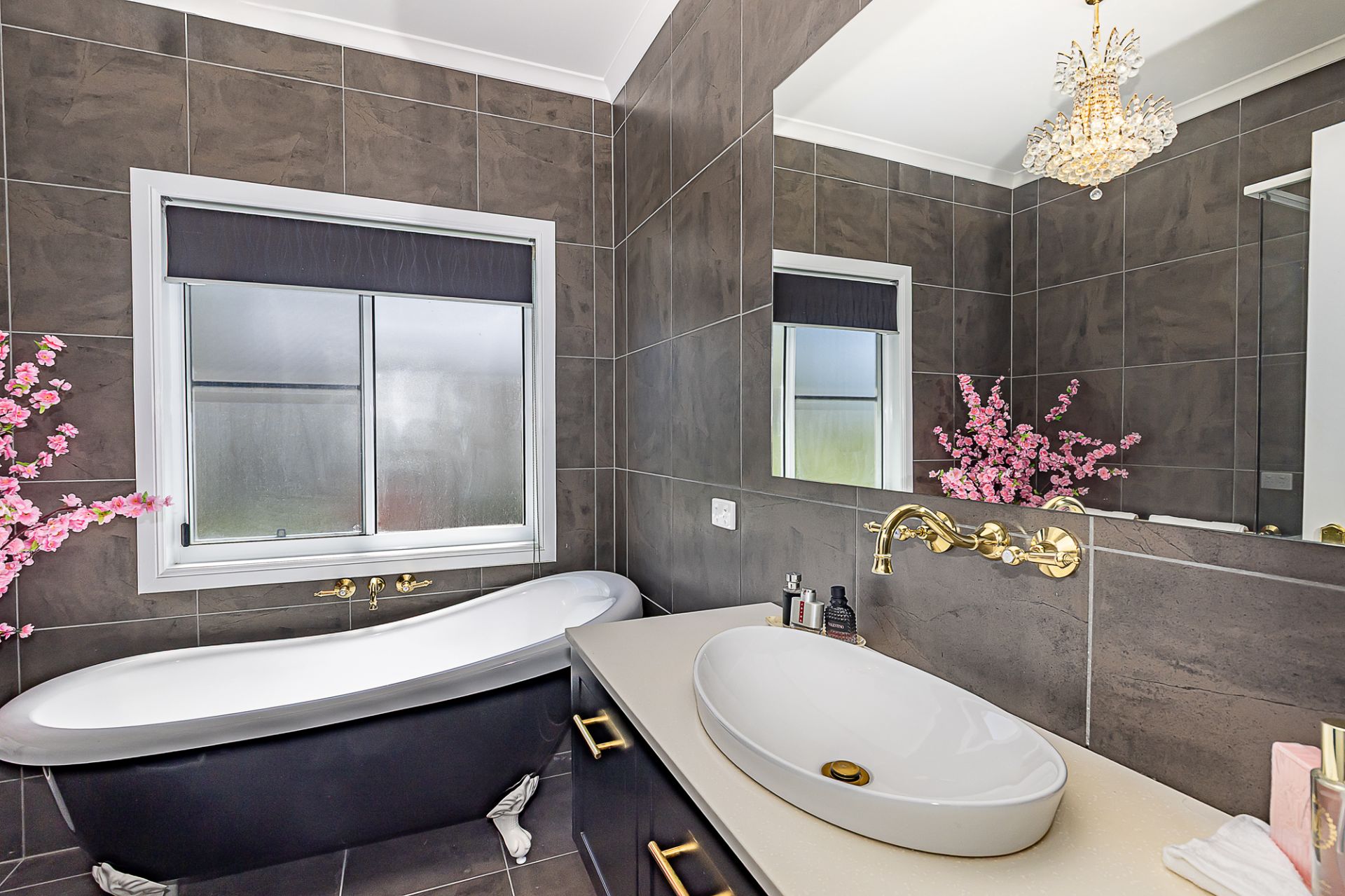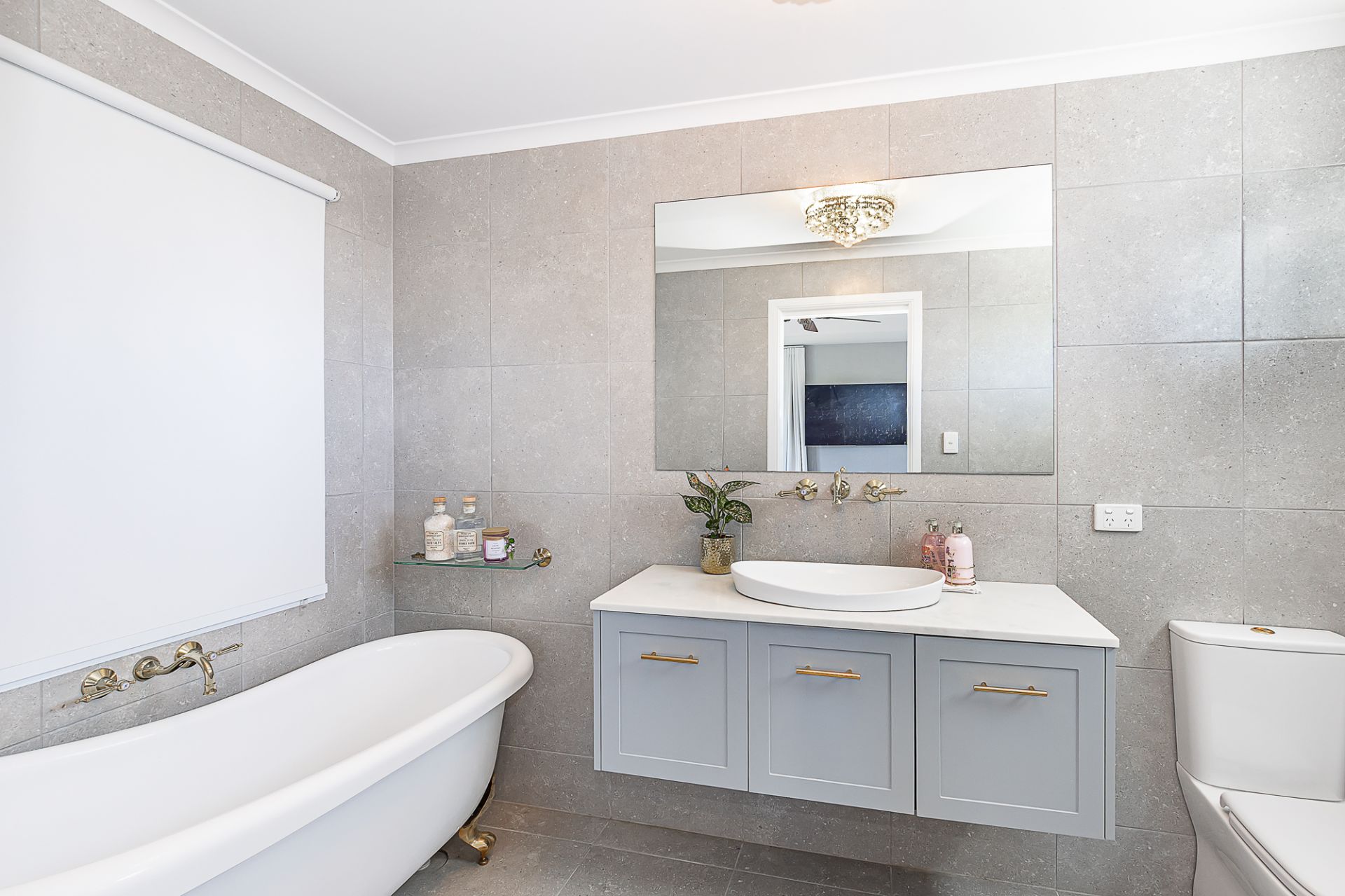 * Stunning ensuite with floor to ceiling tiles, wall hung vanity with stone benchtop, lovely long claw bathtub and feature tapware