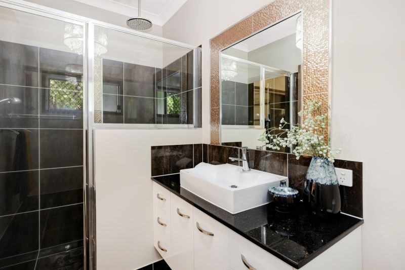 * Stylish ensuite featuring twin showers, black gloss tiles, and stone benchtops.