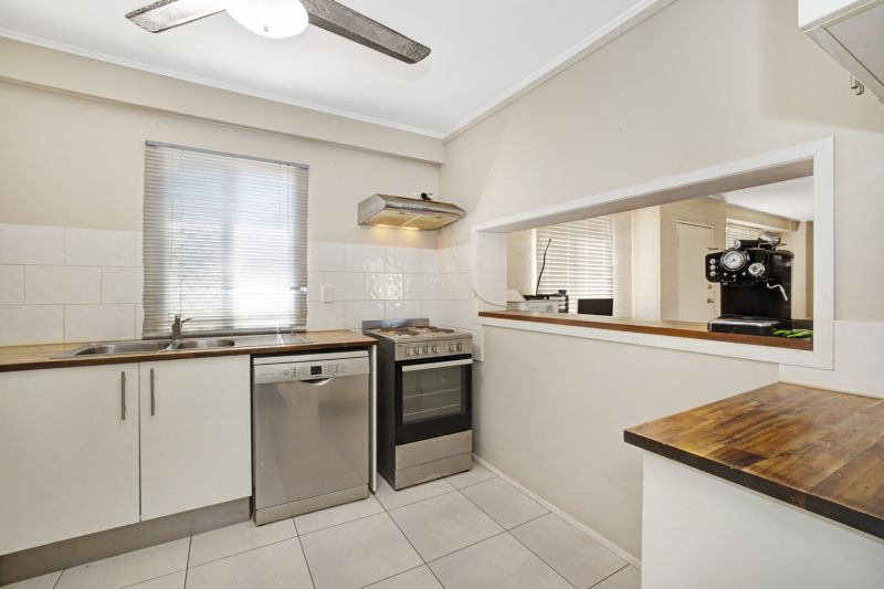 - A contemporary kitchen featuring timber benchtops, a dishwasher, ample pantry space, and a servery to the dining area.