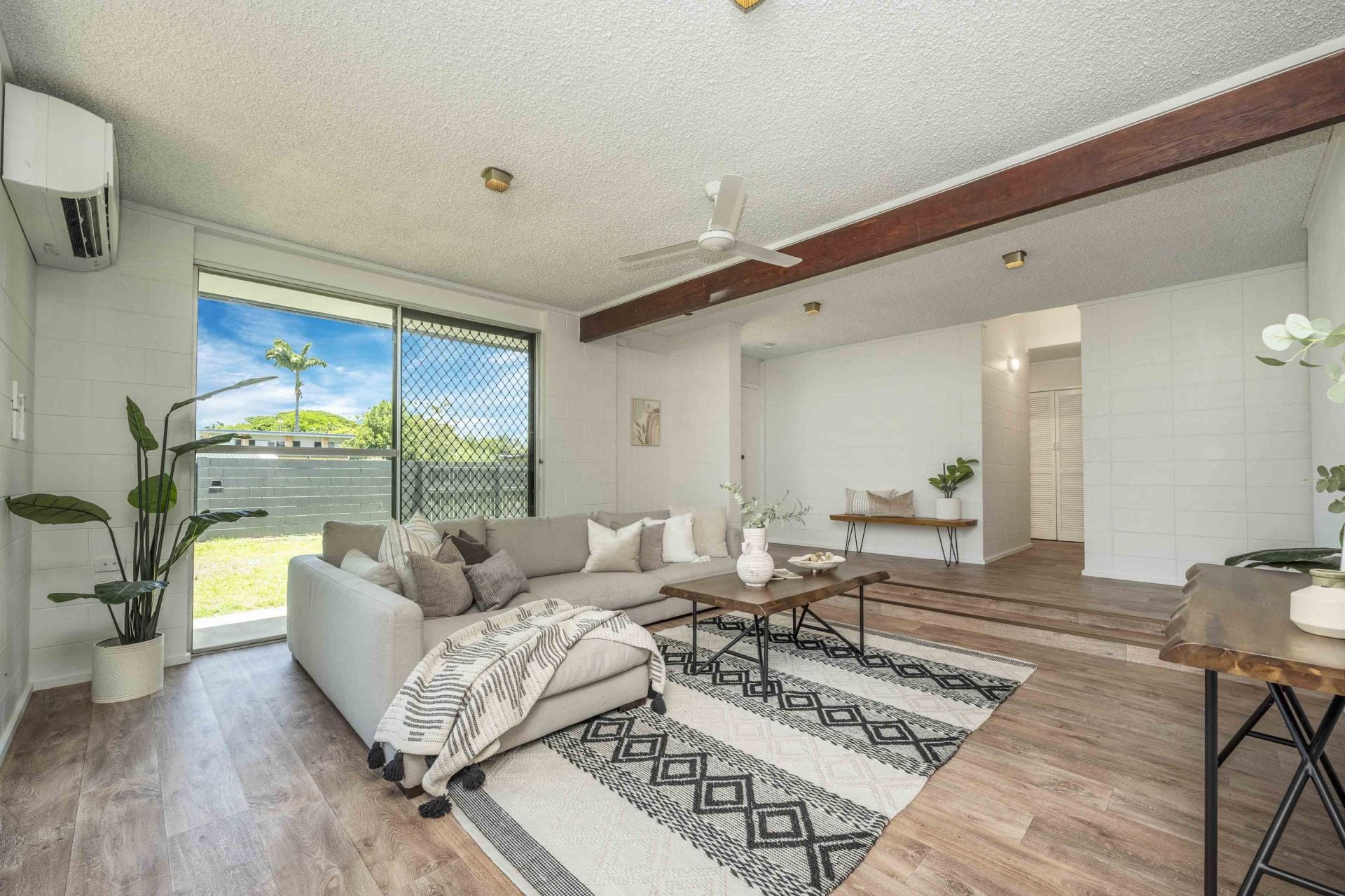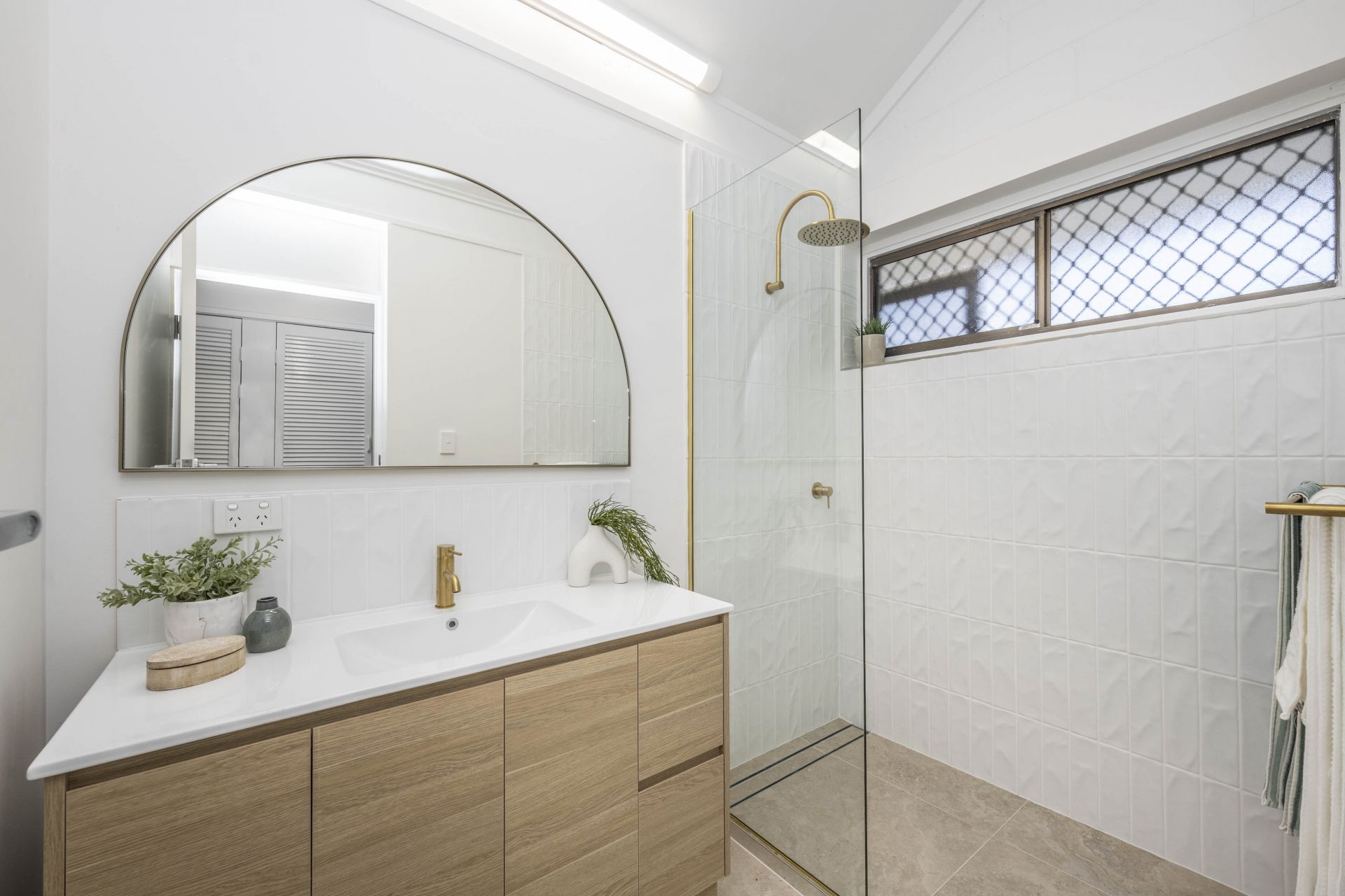 Inside, the newly installed kitchen brings a clean, modern look with crisp cabinetry, updated appliances and contemporary styling. All three bedrooms are air-conditioned and finished in soft neutral tones. The renovated bathroom features a timber vanity, curved mirror and brushed brass fixtures, adding a stylish touch to the home.