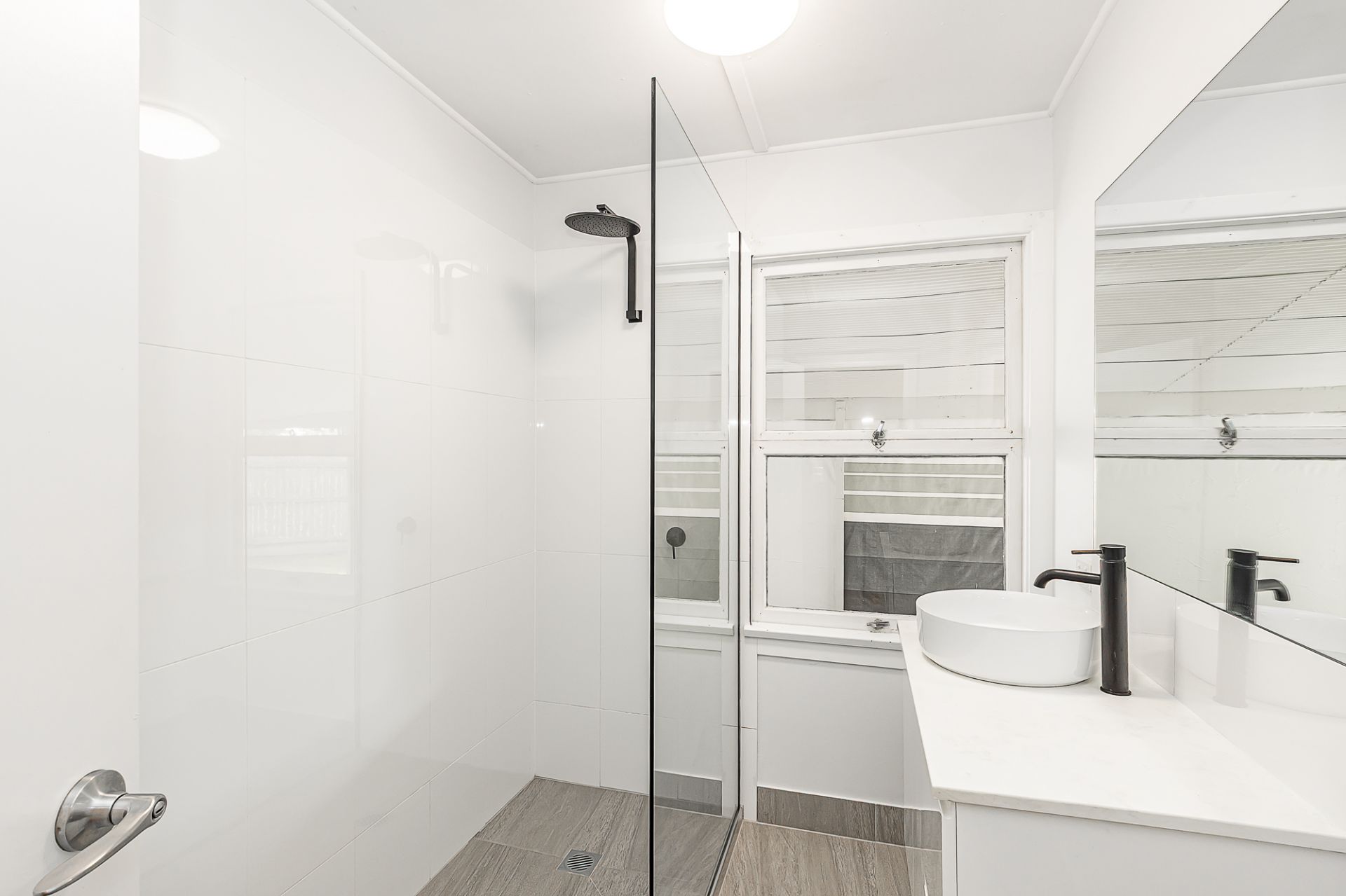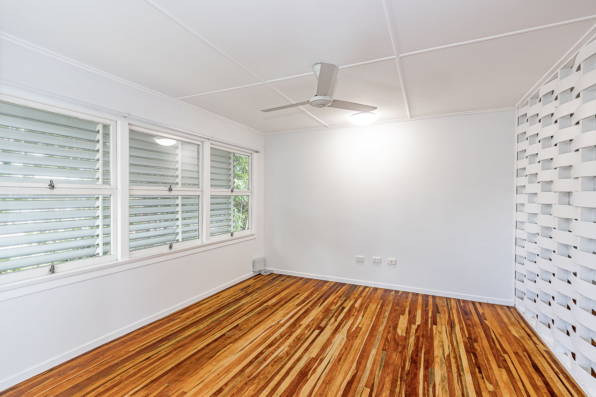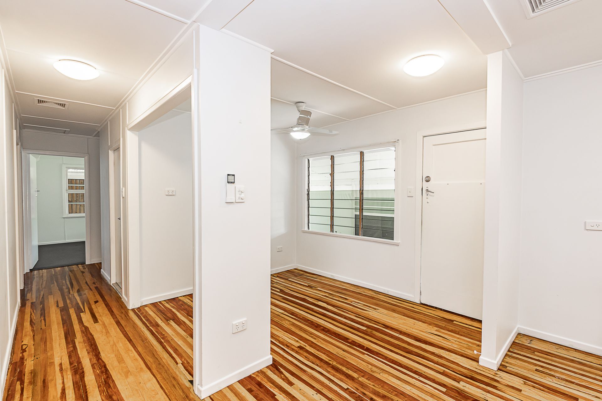 The bathroom has been modernized with clean, contemporary finishes, while air conditioning and ceiling fans enhance year round livability.