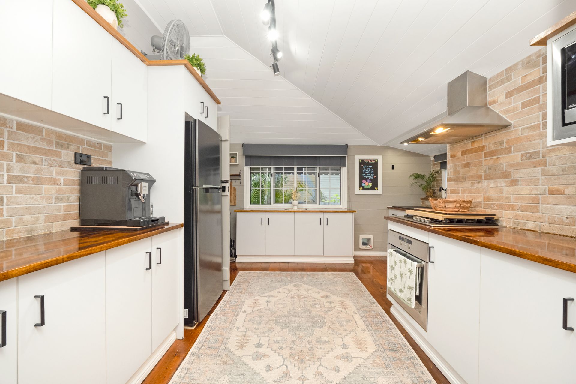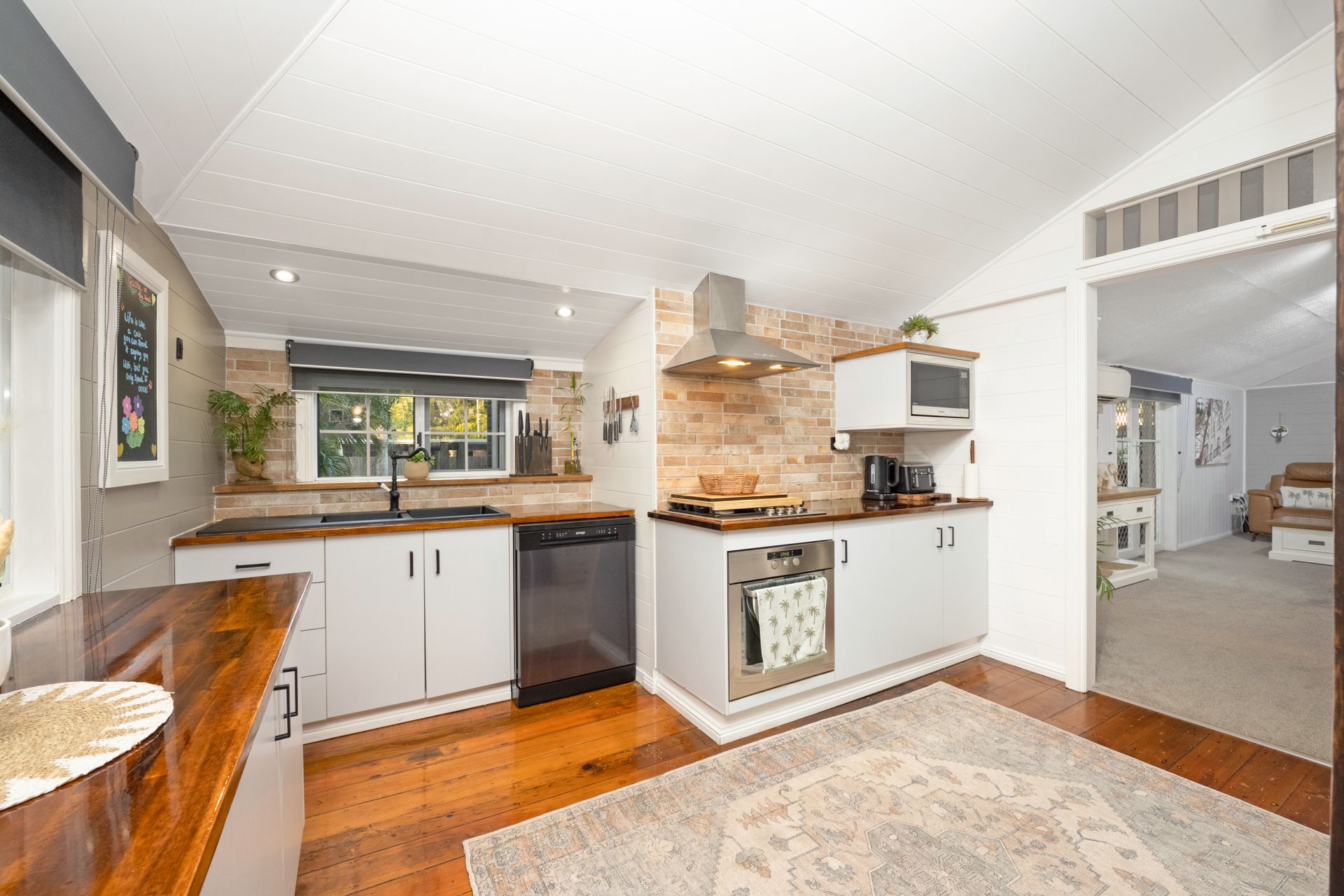 • Immaculate kitchen with timber benchtops, brick feature splashback, dishwasher and great storage