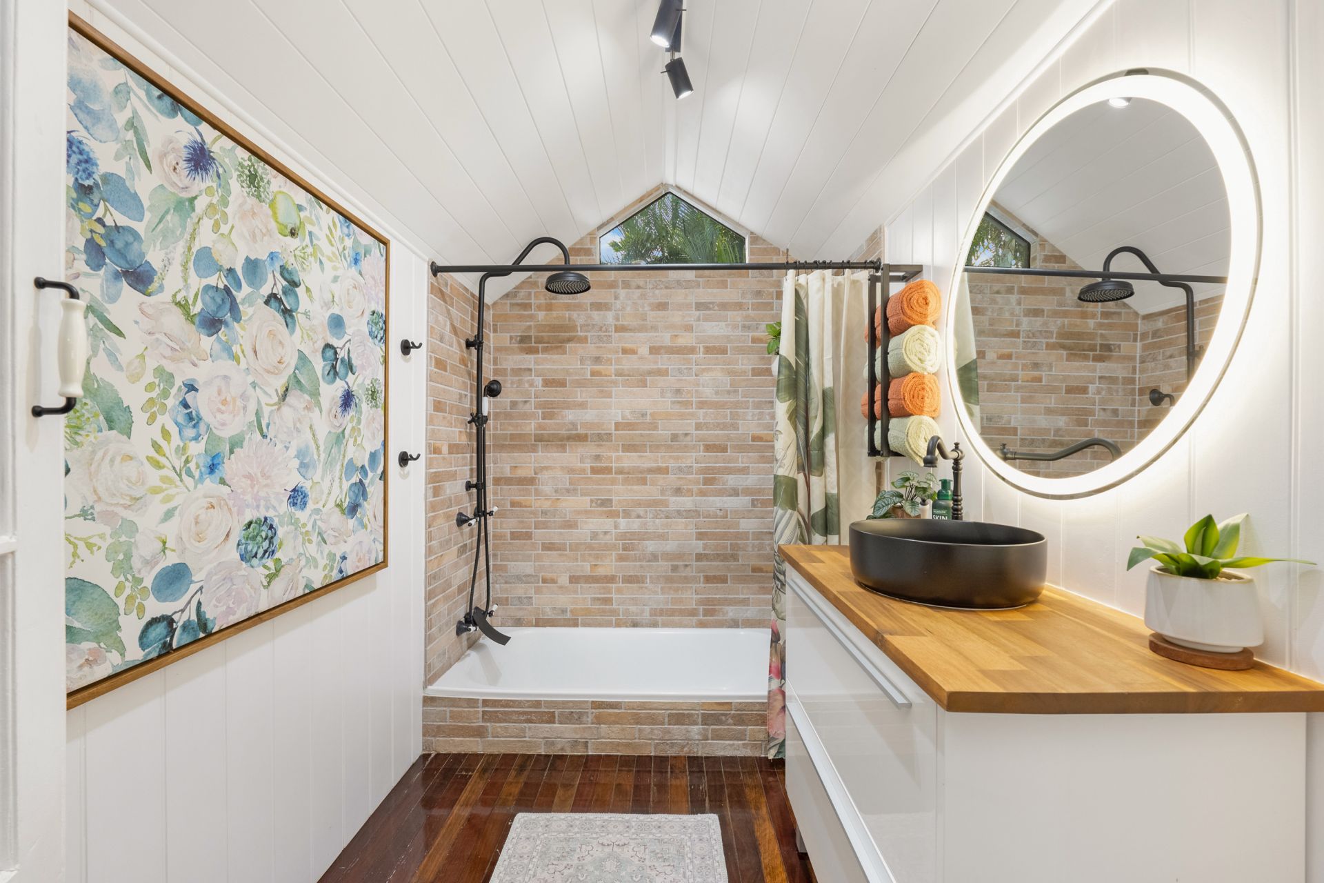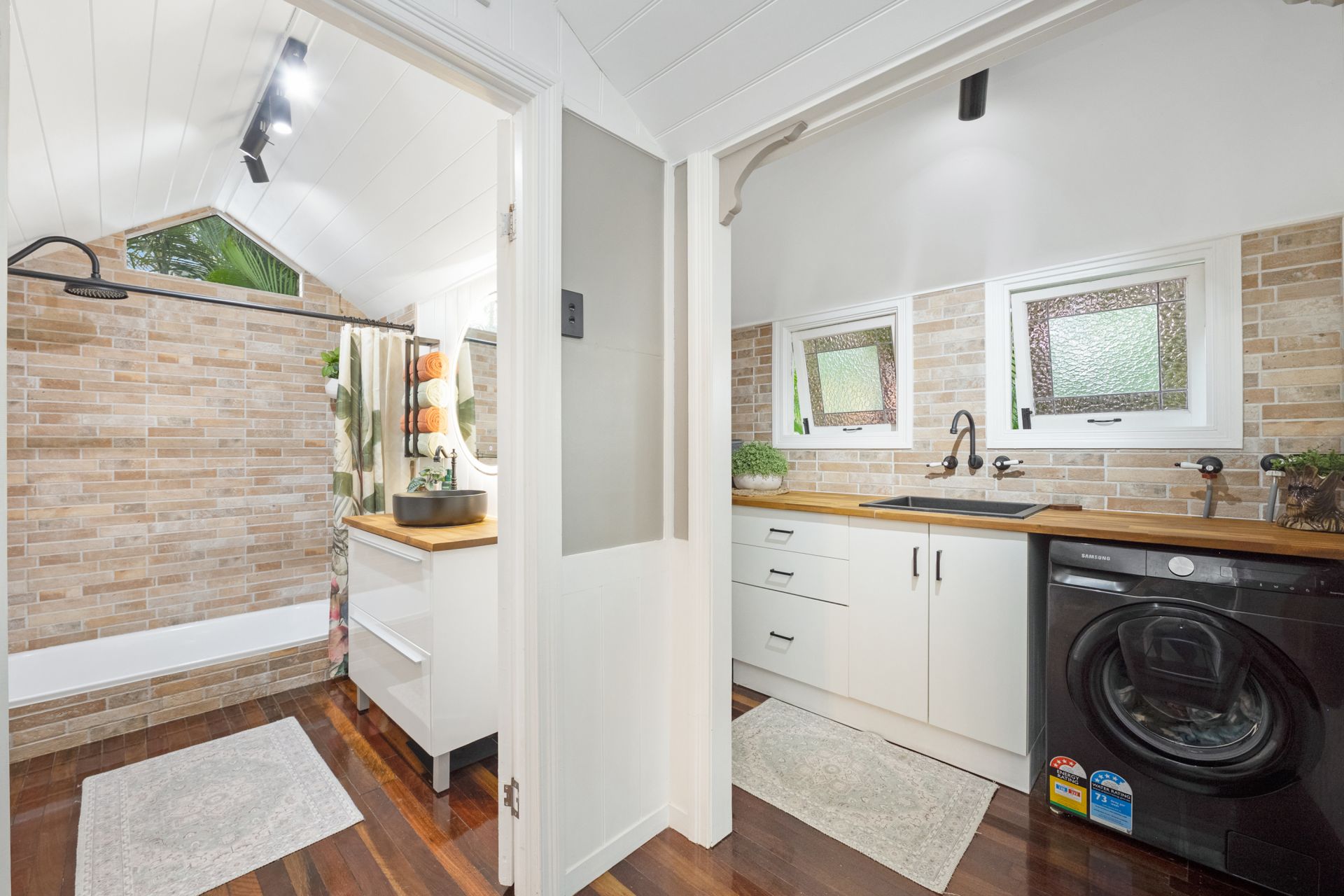 • Stylish bathroom with floor-to-ceiling brick tiling, shower/tub combo and a lovely timber top vanity with updated fittings.