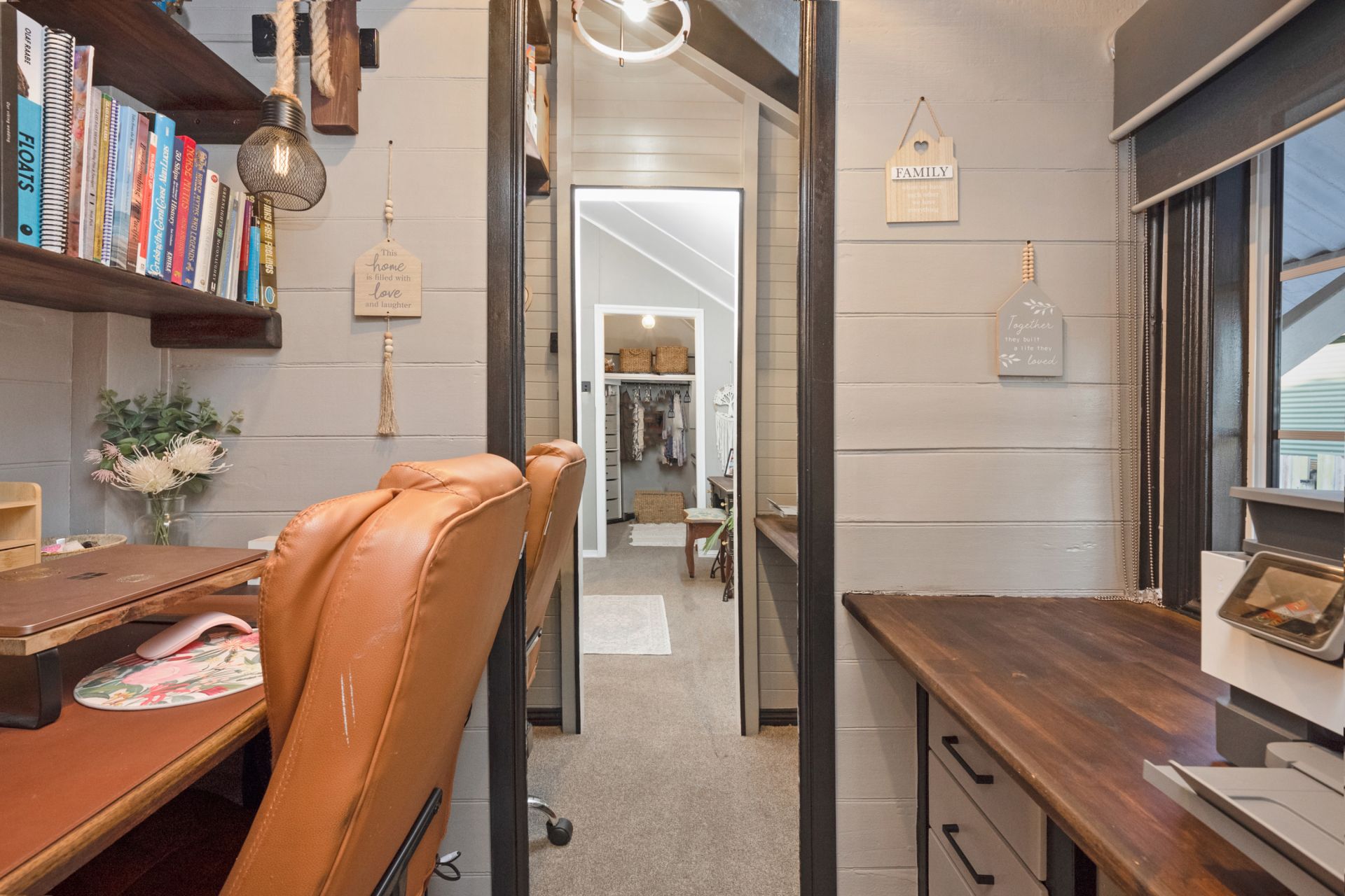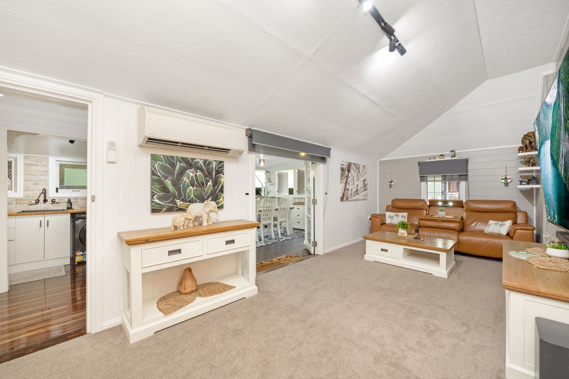 • Open-plan living area with neutral tones and split system cooling
