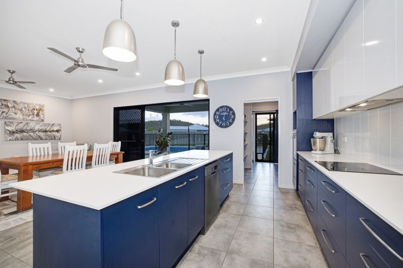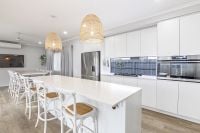 - The kitchen would suit the most fastidious chef minded individual and makes hosting a delight, galley style design, beautiful colour palette, smart 'Google' pendant lights, stone bench tops, dishwasher, rangehood, wall oven, cook top, ample bench and cupboard space, walk through pantry with a large plumbed refrigerator recess, which leads to the laundry which also offers stone benchtop laundry area, an abundance of storage, with access to the exterior of the home via the sliding glass doors