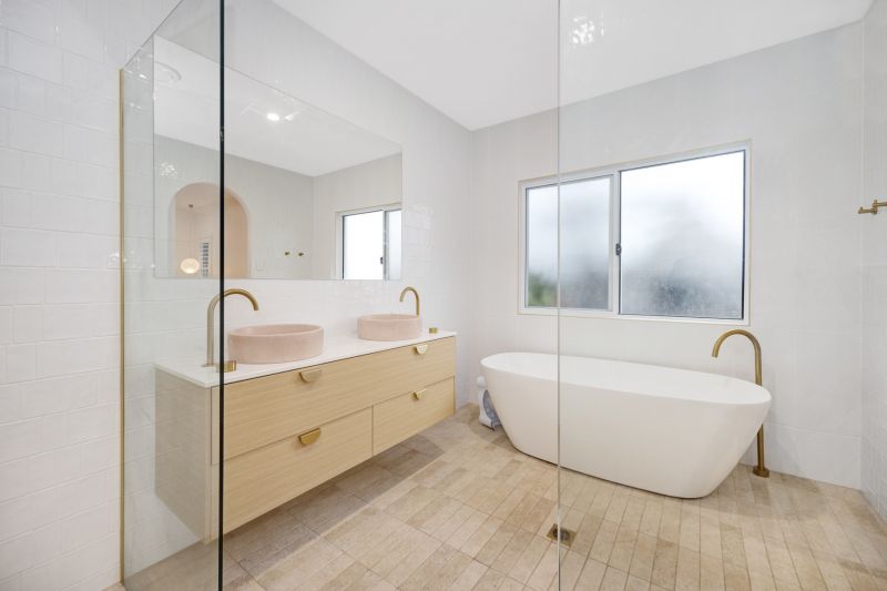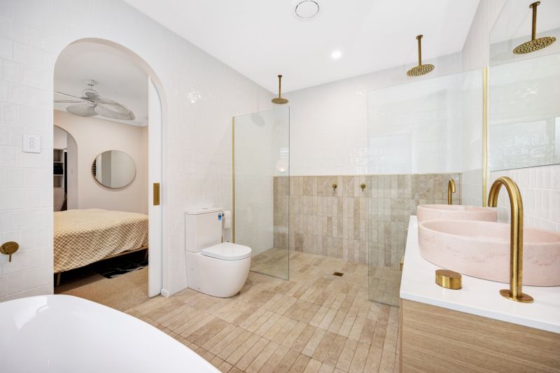 •Statement master suite designed as a private sanctuary, featuring generous walk-in robe with abundant hanging and storage space, hotel inspired ensuite with dual rain-head showers and elegant niches, floor to ceiling tiles throughout, freestanding designer bath creating a true spa-at-home experience, wall hung stone top vanity with dual sinks, Soft natural stone textures and brushed brass fixtures for a warm, sophisticated finish