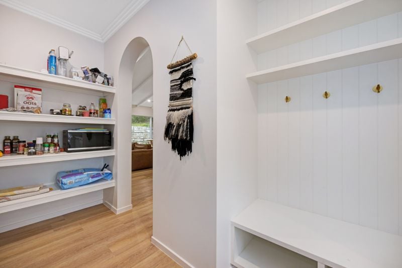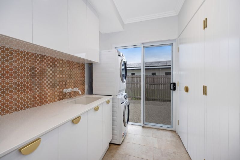 •Beautifully appointed laundry with custom cabinetry, stone benchtops, ample storage and premium tiled splash backs, direct external access, adjoining the mudroom and storage area