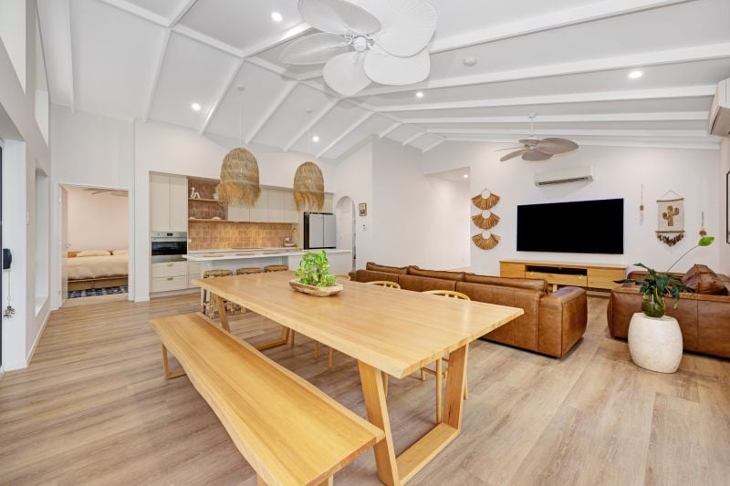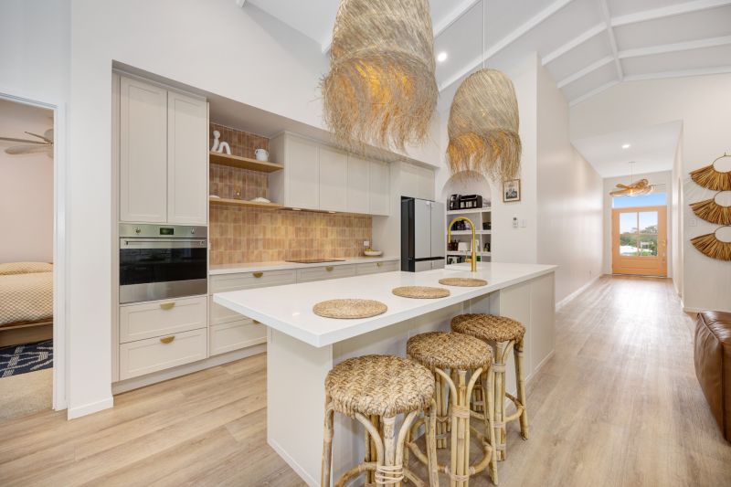 •Light filled open plan living and dining zone, enhanced by soaring raked style ceilings that amplify space, airflow and architectural presence, a calming coastal palette that compliments natural light