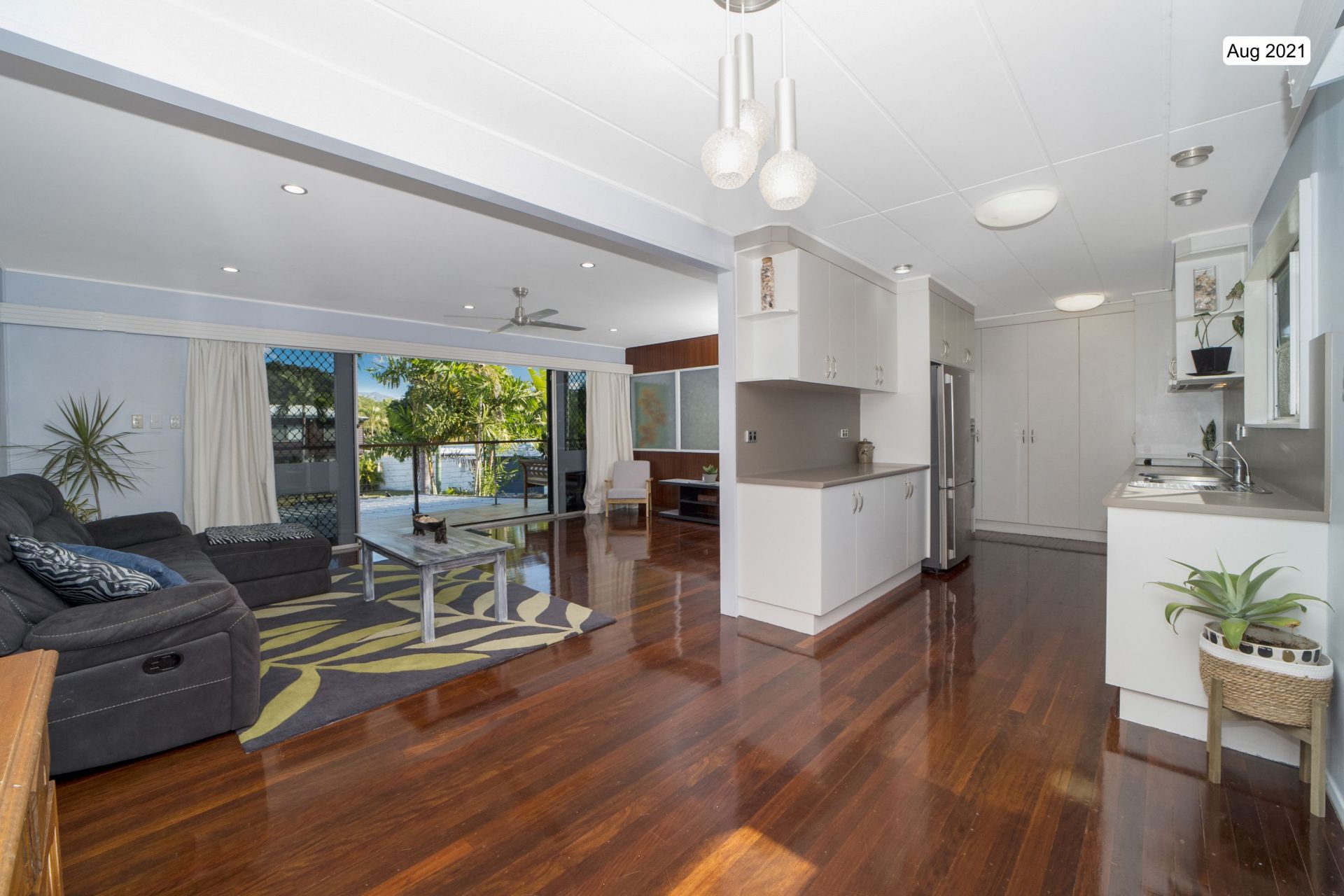 Open plan living and dining area with deck upstairs
