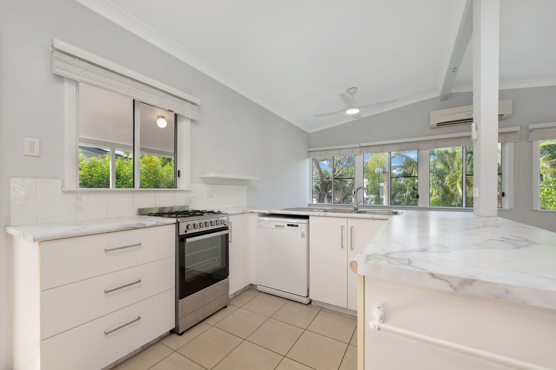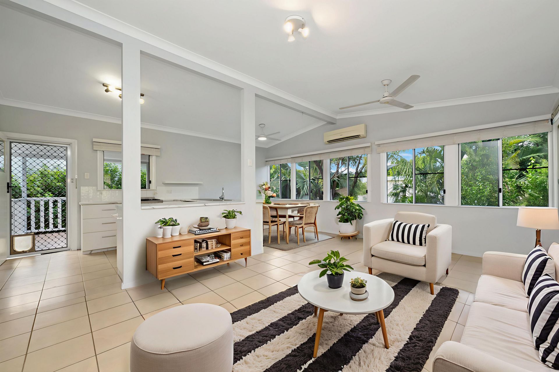Upstairs, an airy open-plan living and dining zone is bathed in natural light, capturing soft tropical breezes while creating a calm, inviting atmosphere for everyday living. The well-appointed kitchen is perfectly placed, making family mealtimes and entertaining a breeze. This level also features three bedrooms, all serviced by a refreshed main bathroom.