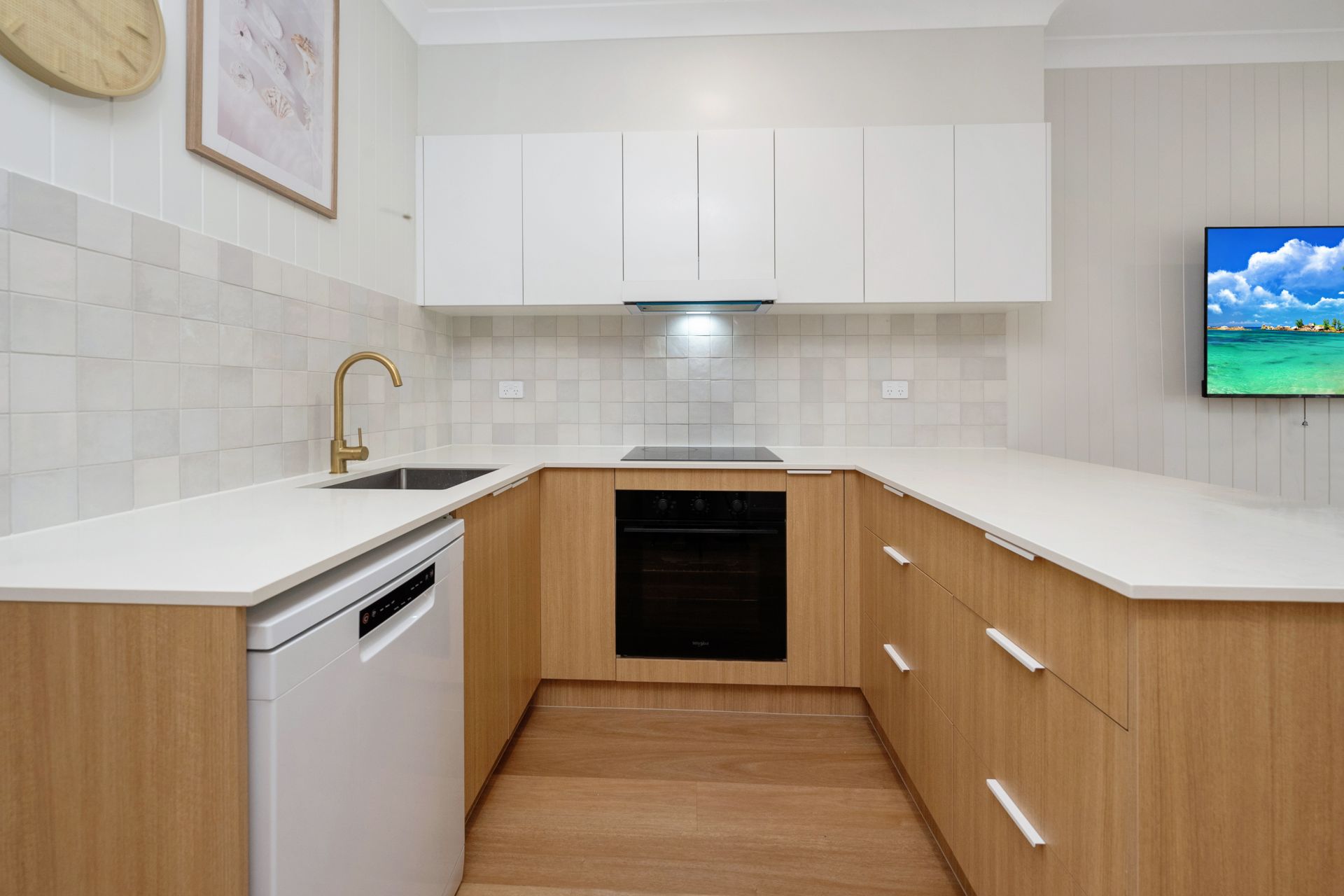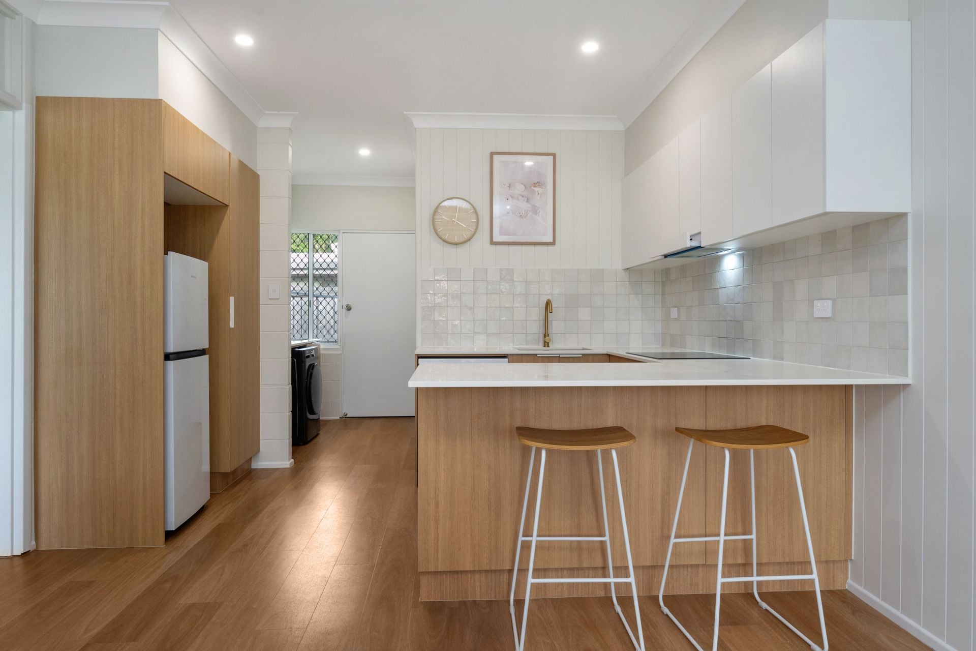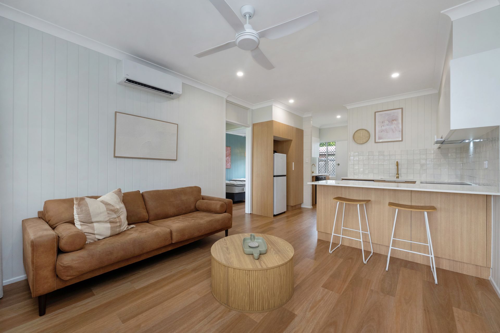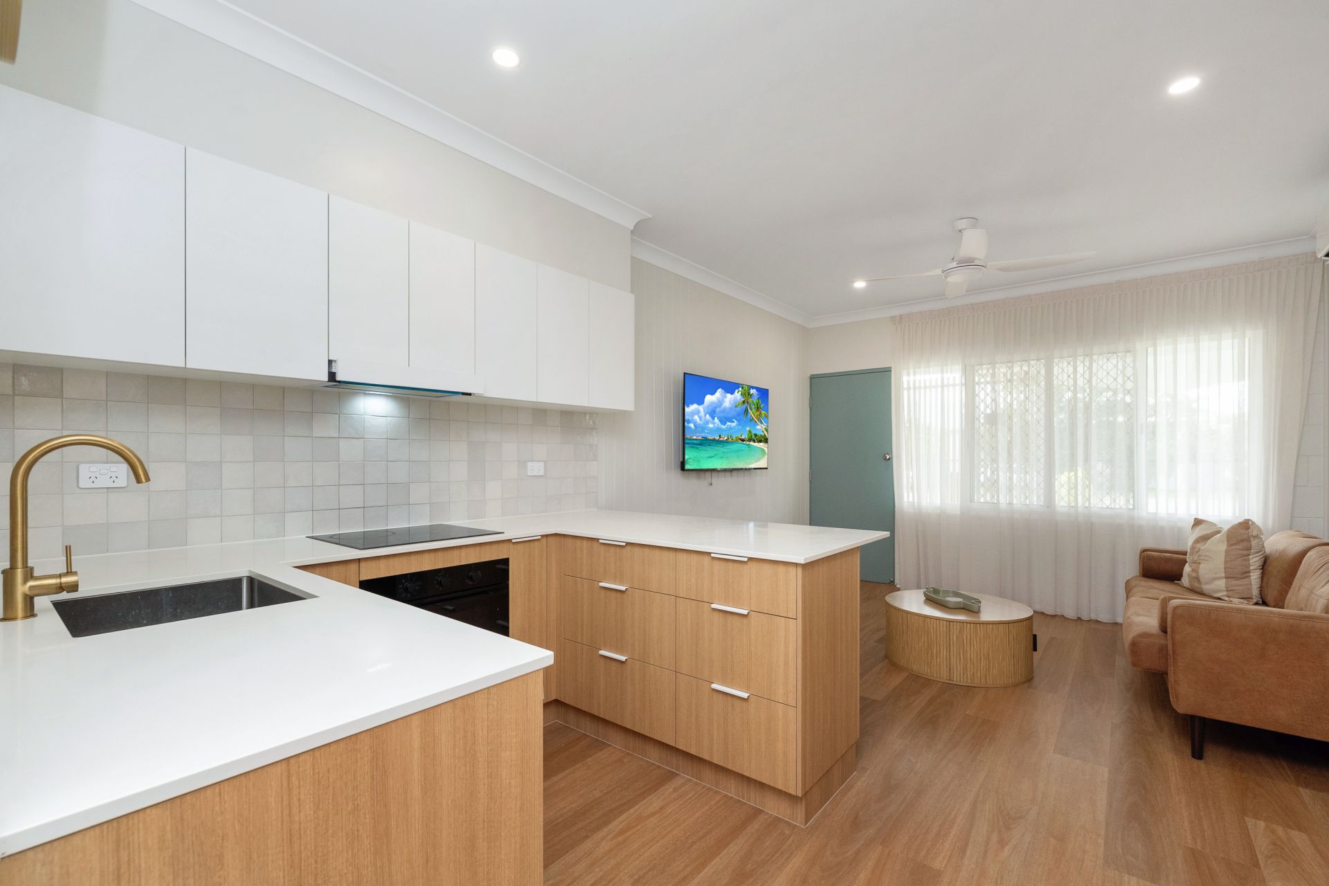 The heart of the home is a sleek, modern kitchen, featuring luxurious brass tapware, expansive bench space, and a design that effortlessly blends functionality with style. The bathroom continues the theme of refinement, with floor-to-ceiling tiles and coordinating brass fittings that elevate the space into a spa-like retreat. Both bedrooms are generously proportioned, offering built-in wardrobes, feature walls that provide character and comfort, and come complete with tasteful furnishings ready for immediate living.
