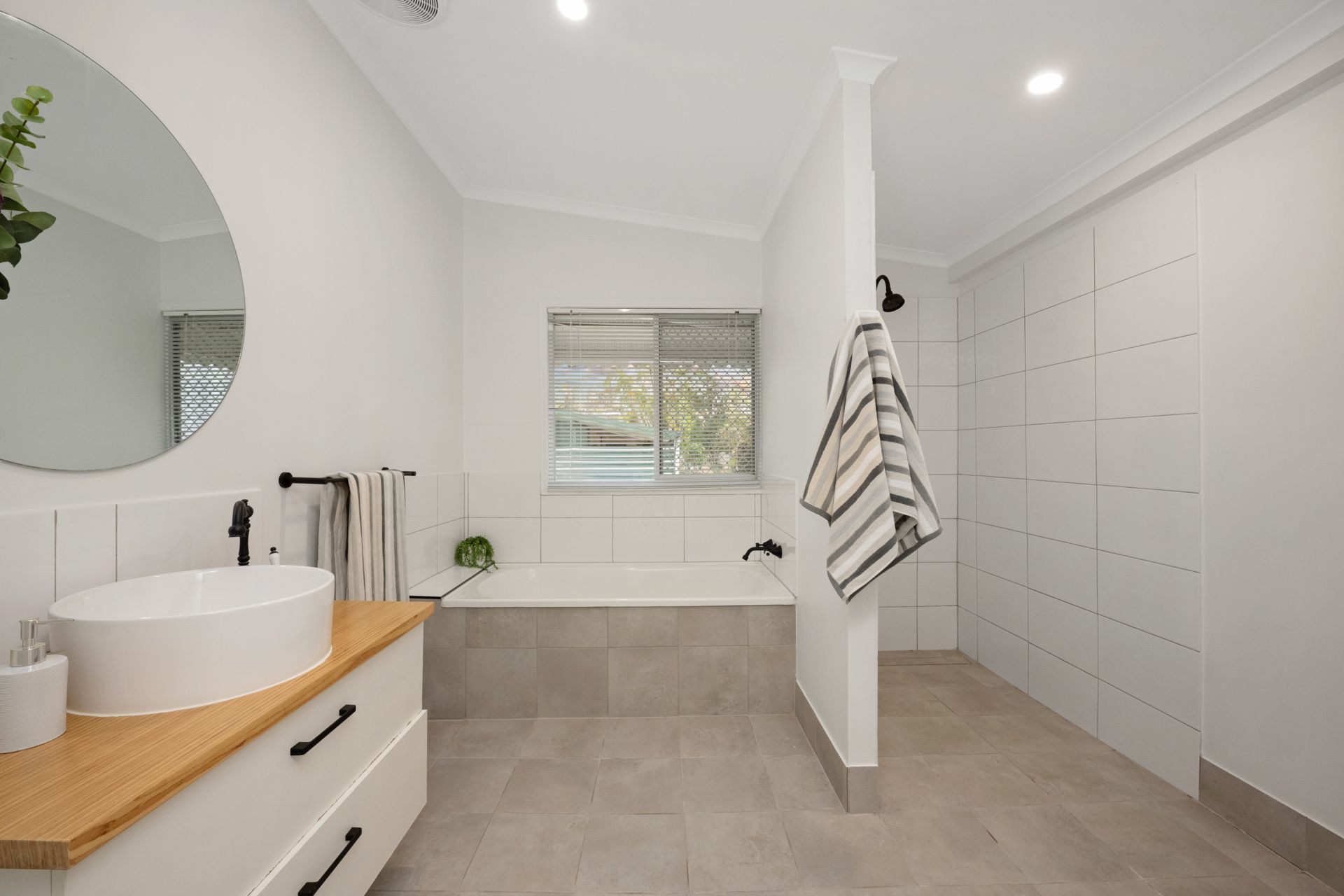 • Stylish modern bathroom with separate bath and shower